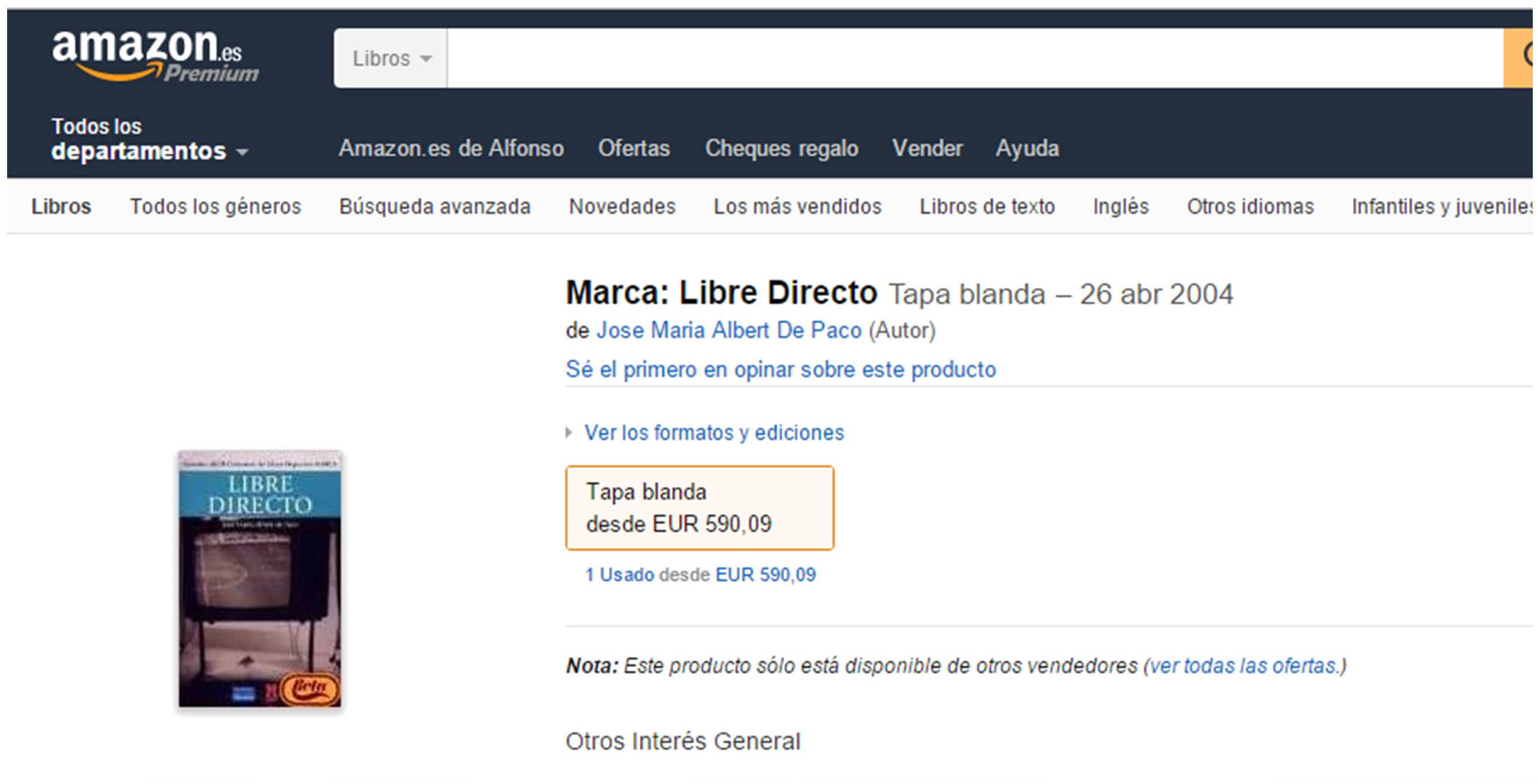 Y la segunda, una oferta de venta de un ejemplar del libro en Amazon, aunque bien podríamos estar hablando de Sotheby’s, ya que el precio de venta que aparece es de … 590€!
