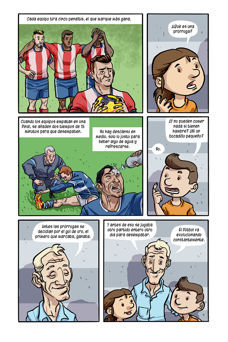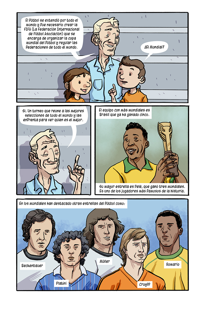 Alguno hace mención a que ya está buscando agente para su hijo, mientras que otro considera que el suyo es una auténtica figura. Mientras tanto, un señor mayor observa la escena y la actitud de niños y padres, y decide intervenir. Lo que hará a partir de entonces es ofrecer a dos de los niños, sus nietos y protagonistas de la historia, el recorrido por el fútbol y todo lo que con él tiene que ver que iremos descubriendo página a página.