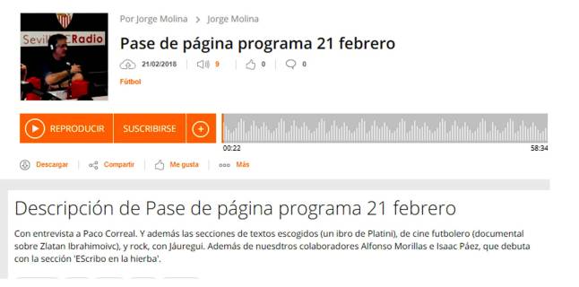 Os dejo con el enlace a la edición de hoy del programa Pase de Página, el único dedicado al fútbol y la cultura que se emite a través de la emisora de radio oficial del Sevilla FC.