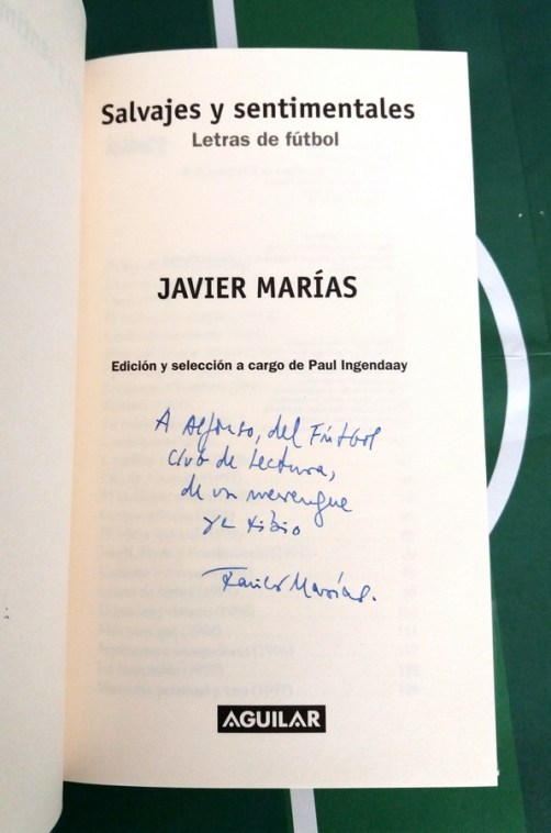 La segunda cosa que conseguí en mi breve momento con Marías fue que me respondiera a una pregunta: “¿Para cuándo un libro futbolero u otra recopilación de artículos?”. Tras unos breves instantes de silencio valorativo, su escueta respuesta fue que últimamente escribía poco sobre fútbol, y que no era algo que contemplara como proyecto. La verdad es que habría preferido que me hubiera dejado la puerta abierta a algún tipo de ilusión, un “bueno, ya veremos”, o “quizá más adelante”. Pero lo cierto es que no hubo nada de eso.