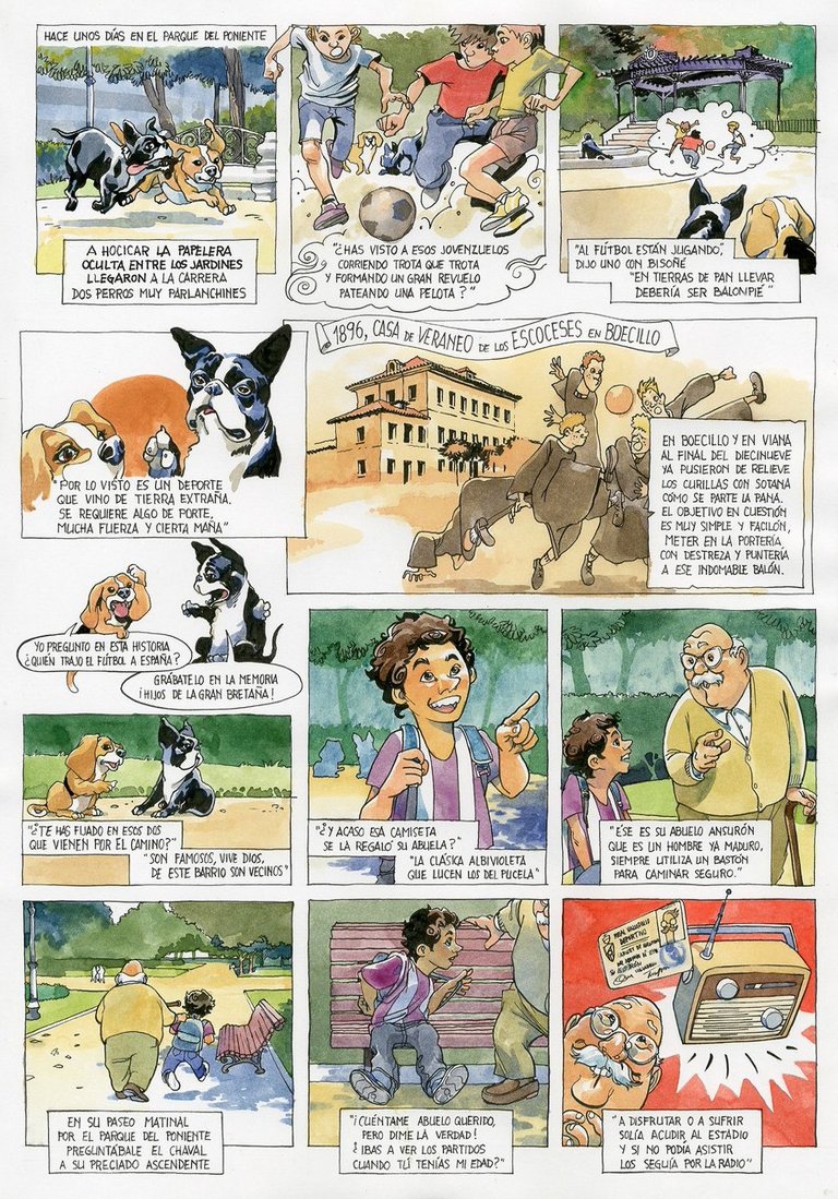 Creo que no me equivoco si afirmo que los clubes de fútbol, a la hora de promover publicaciones para explicar su historia, no han explotado del todo las posibilidades de los cómics. Pese a tratarse de un formato de fructífera relación en el campo de la literatura futbolera, y aún reuniendo una serie de características que lo convierten en medio ideal a la hora de actuar con finalidad pedagógica, no me consta que haya sido especialmente utilizado, como decía, para dar a conocer a los apasionados del fútbol la evolución de su entidad a lo largo del tiempo.