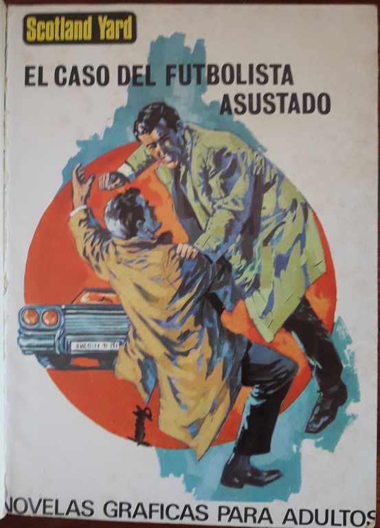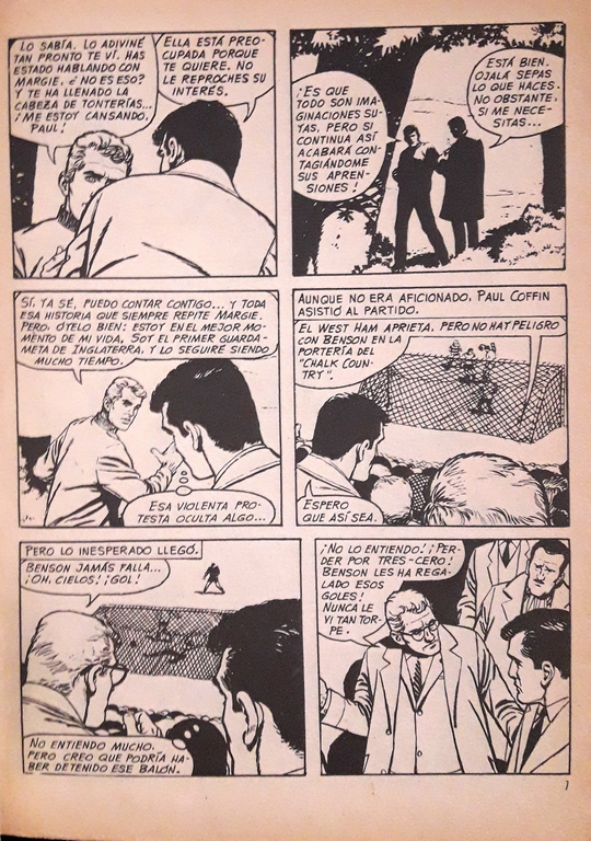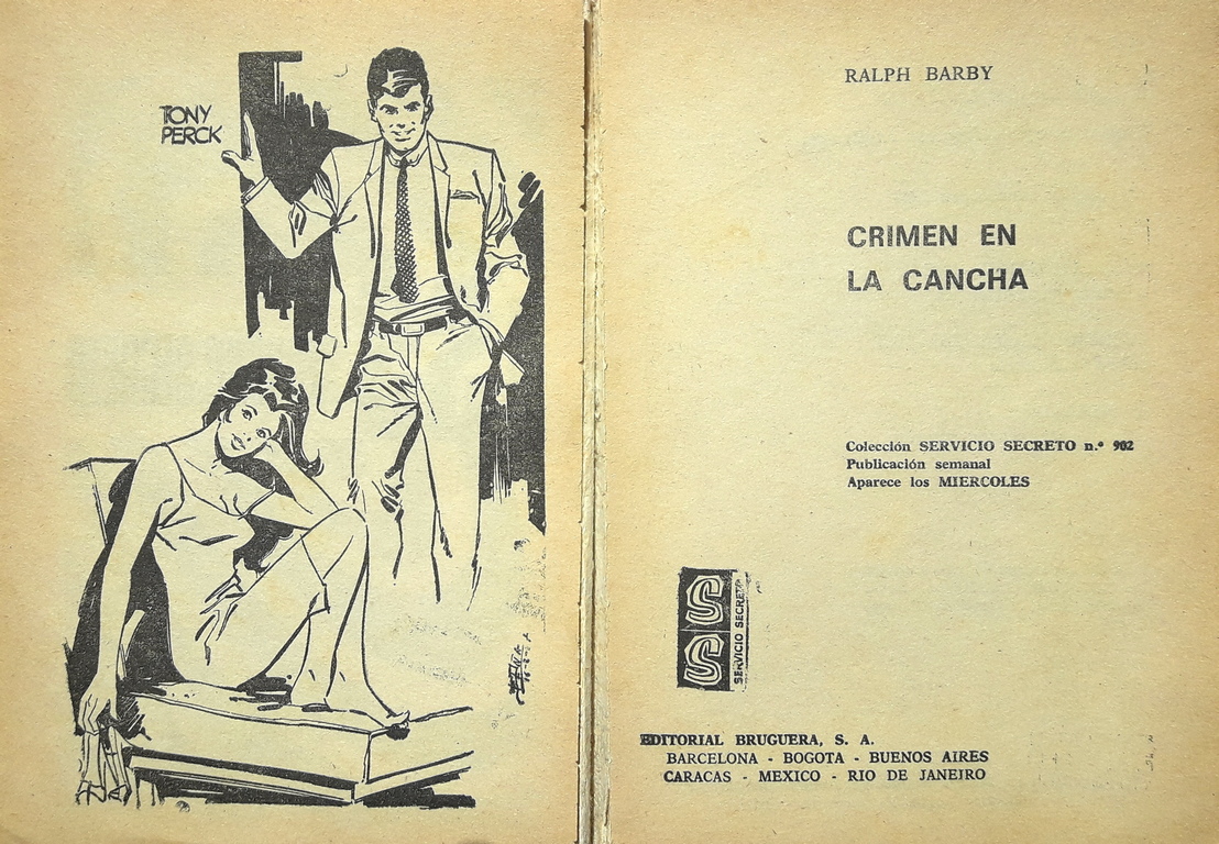 El conjunto de su producción es tan variado que se me ocurrió que quizá se incluyera en su extenso catálogo alguna obra de temática futbolera, así que me decidí a escribirle y le pregunté por ello. Su respuesta no pudo alegrarme más, pues me informaba de que, efectivamente, en 1967 escribió una novela de título tan significativo y llamativo como «Crimen en la cancha«, publicada con el número 902 en la colección Servicio Secreto de la Editorial Bruguera. Como peculiaridad, indicar que el número de páginas es de 126, frente a las habituales 96 del tradicional formato de los bolsilibros. La portada es de Jaime Provenzal, y también incluye una ilustración interior obra de Peña.