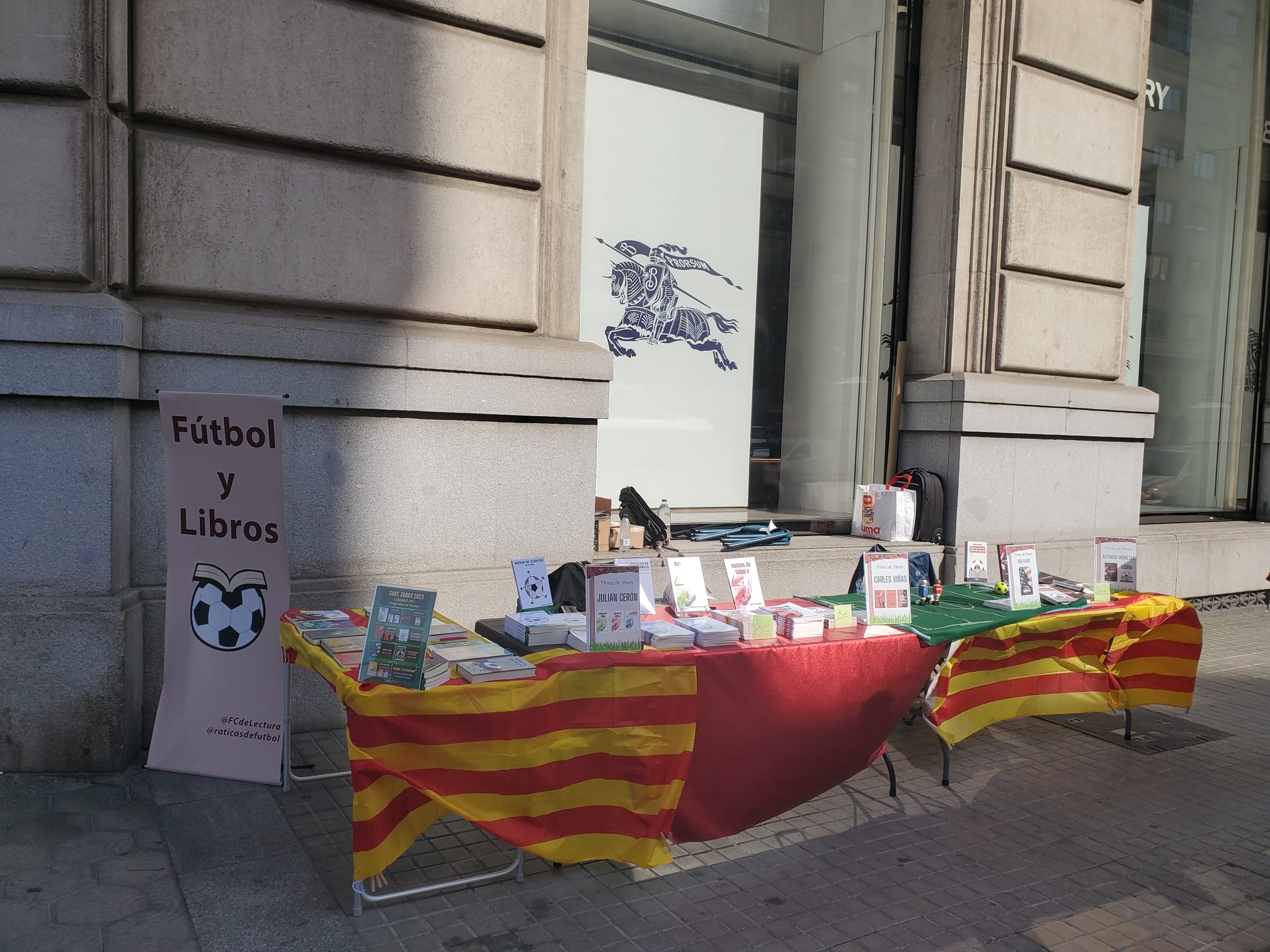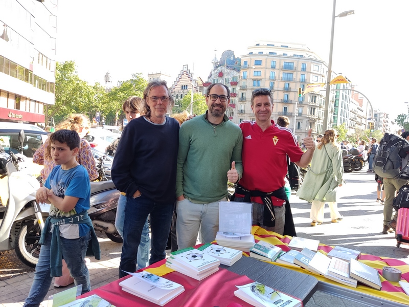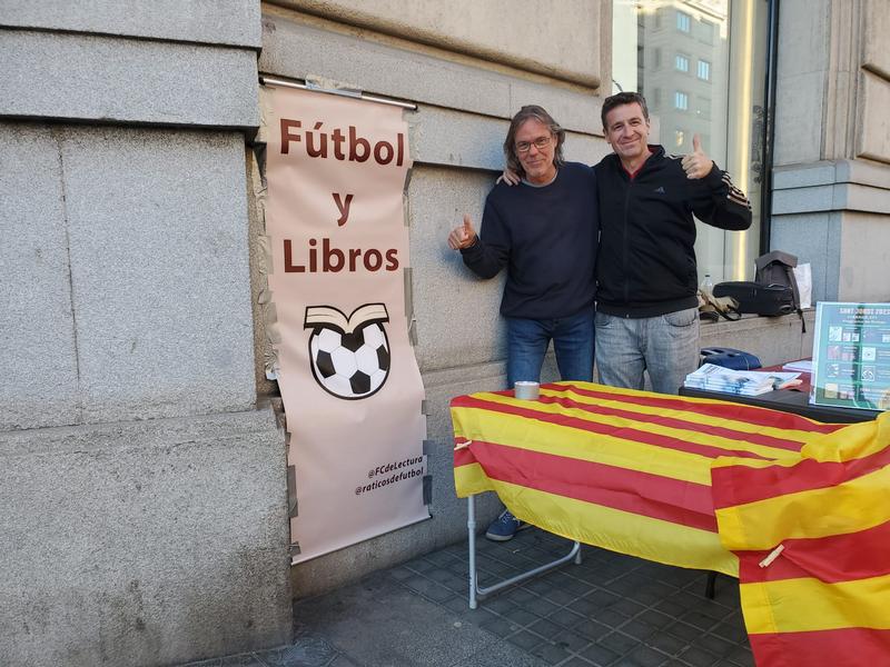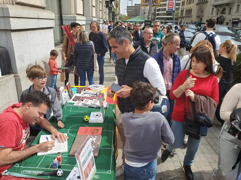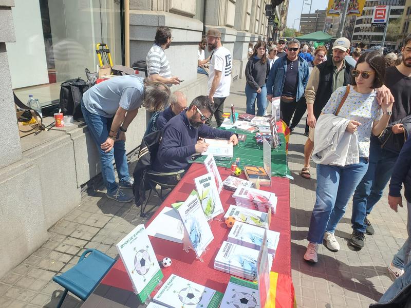 El pasado domingo, Diada de Sant Jordi en la que se regalan libros y rosas en Catalunya, volvió a ser un magnífico día. Junto al amigo Julián Cerón (@raticosdefutbol) volvimos a montar una parada con nuestros libros y que sirvió, a la vez, para que algunos autores con obra futbolera vinieran a firmar sus obras.