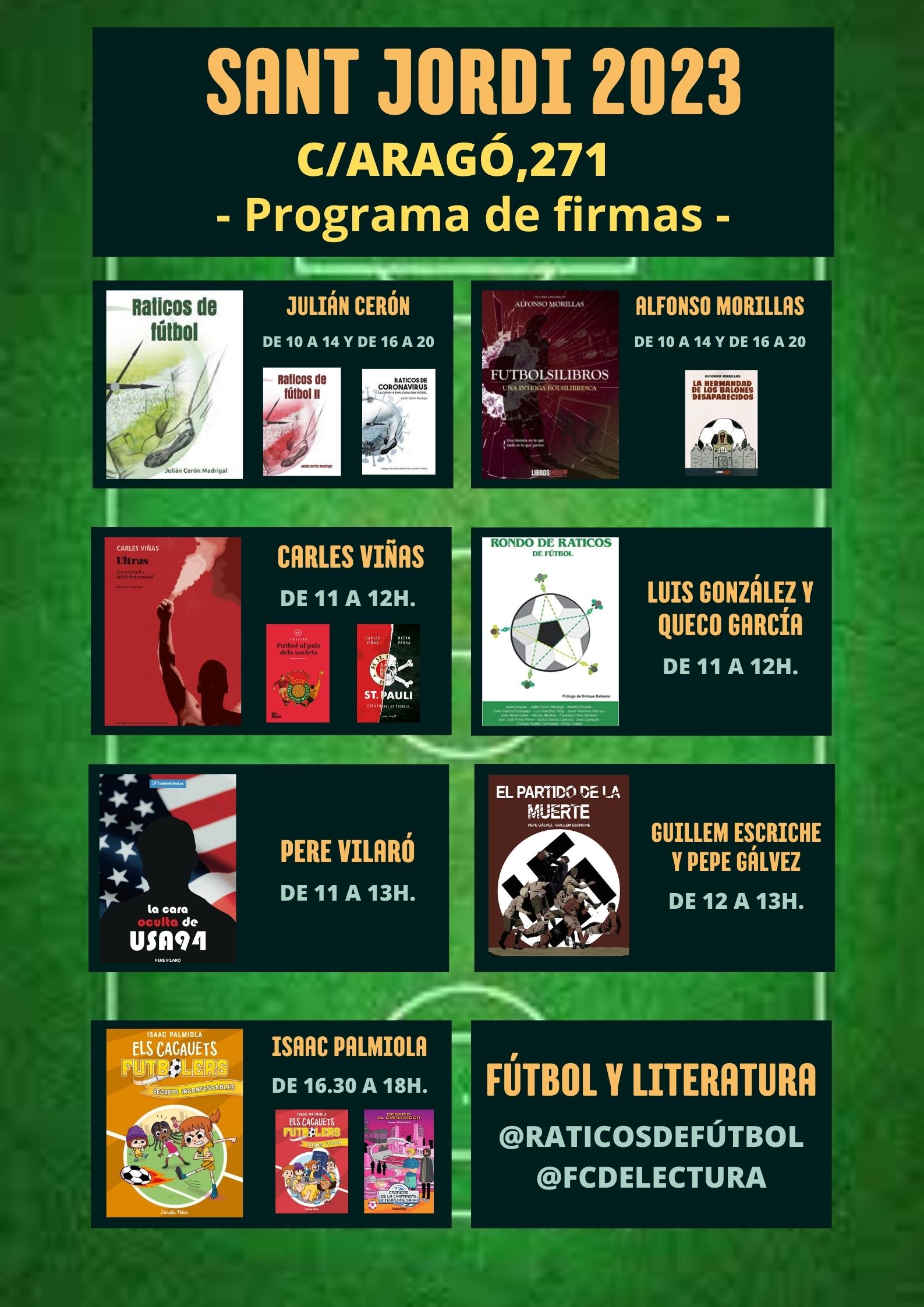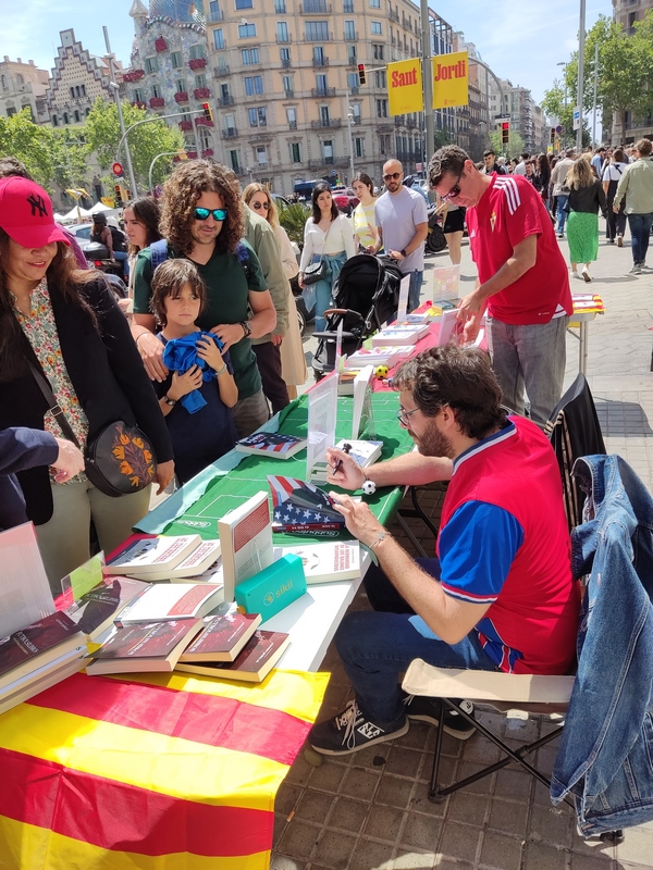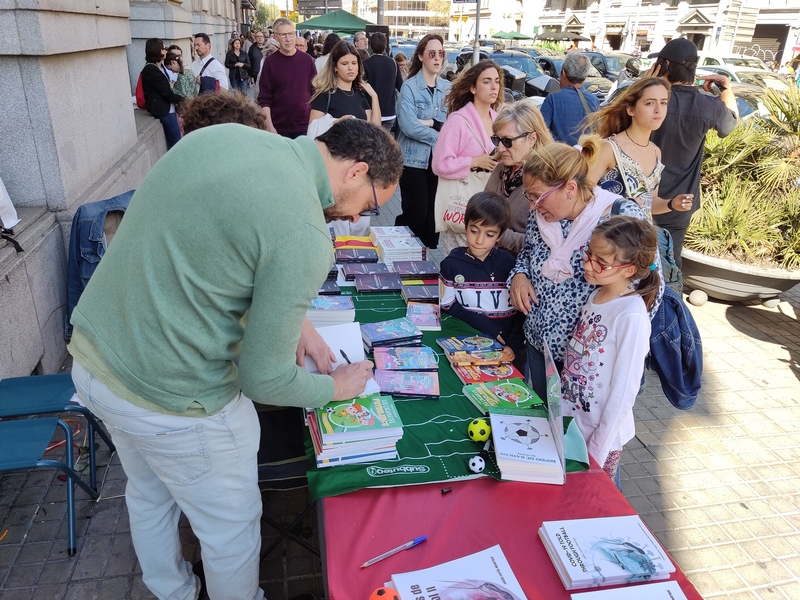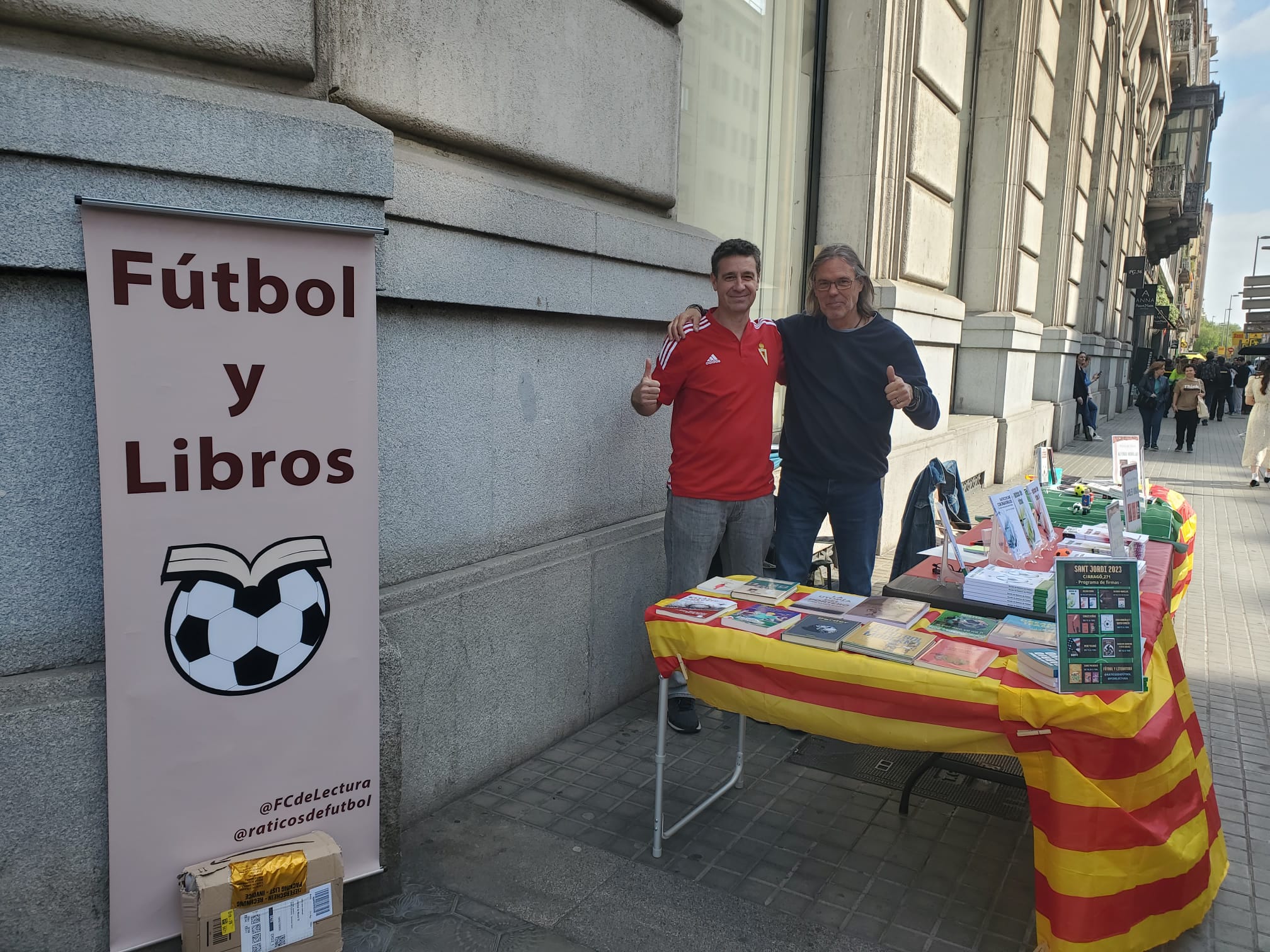 El pasado domingo, Diada de Sant Jordi en la que se regalan libros y rosas en Catalunya, volvió a ser un magnífico día. Junto al amigo Julián Cerón (@raticosdefutbol) volvimos a montar una parada con nuestros libros y que sirvió, a la vez, para que algunos autores con obra futbolera vinieran a firmar sus obras.