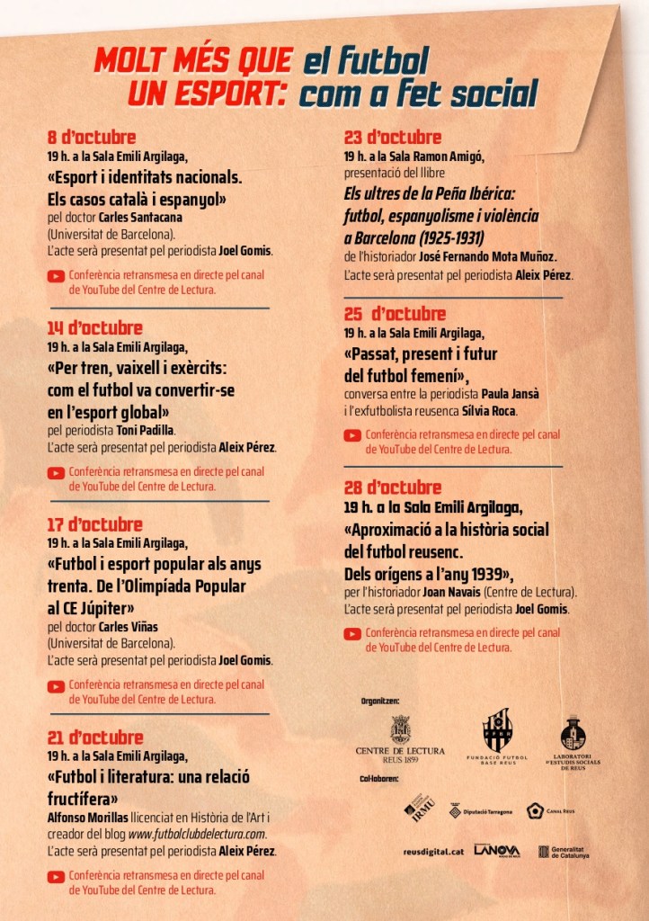El cierre de estas interesantísimas jornadas tendrá lugar el viernes 28 de octubre, cuando el historiador Joan Navais, presentado por el periodista Joel Gomis, ofrecerá una Aproximació a la història social del futbol reusenc. Dels orígens a l’any 1939.
