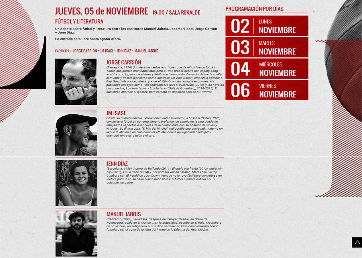 El programa principal constará de seis encuentros temáticos en los cuales se indagará en diferentes aspectos de la relación fútbol-literatura. Como invitados, este año estarán, entre otros, escritores y artistas como Philip Kerr, Héctor Abad Faciolince, Valerio Magrelli, Unai Elorriaga, Agustín Fernández-Mallo, Pablo Nacach, Jasone Osoro, Alaia Martin, o el cantante de Los Planetas, Jota.