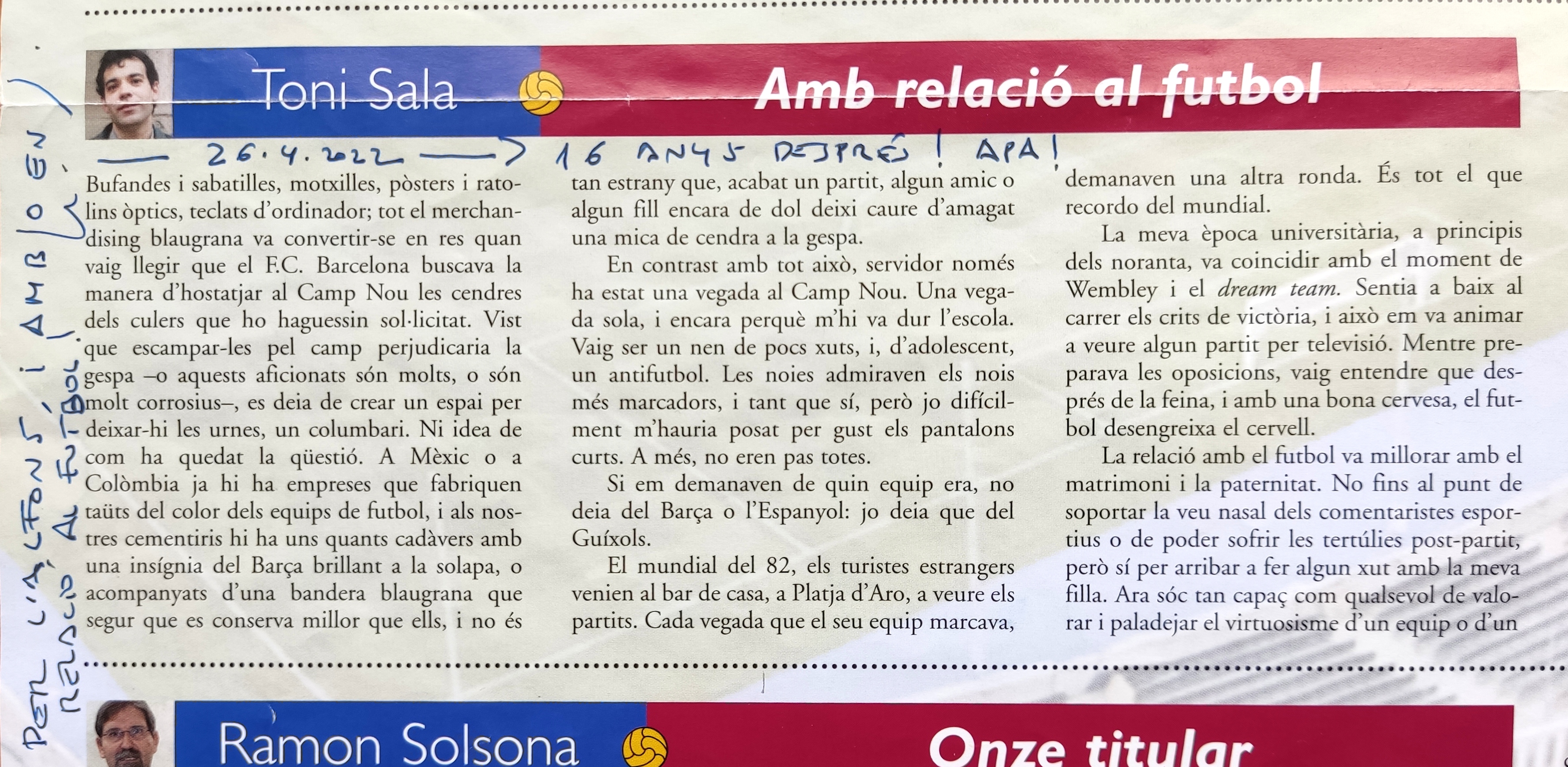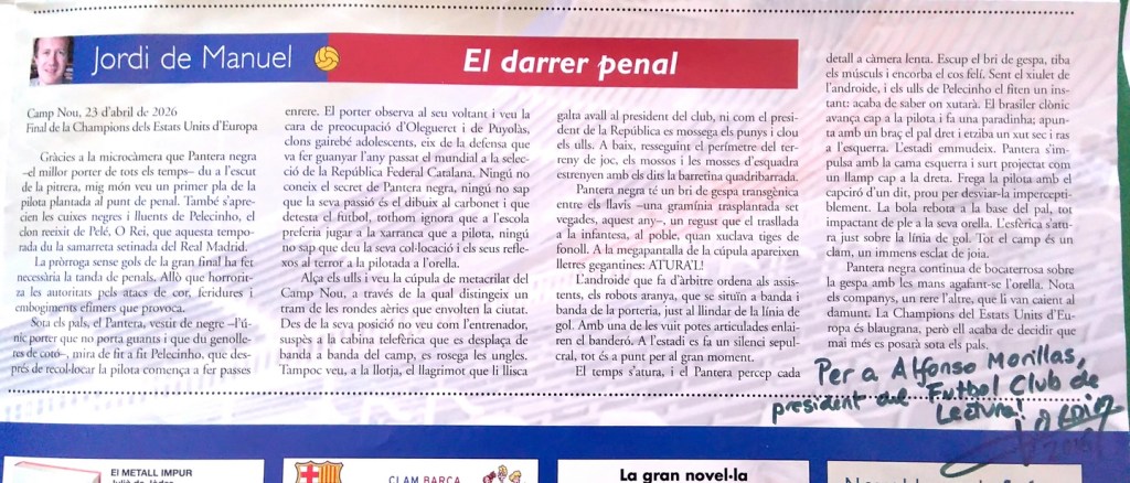 “Per això vaig plantejar el text com una gran final, i el vaig dividir en les parts d’un partit. Vaig trobar que era la manera de retre un modest homenatge a les meves dues passions: el futbol i la literatura”