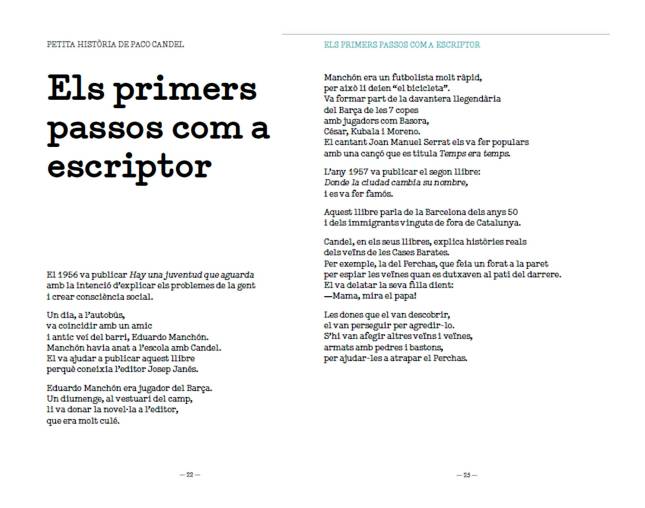 “El Pista me llamó después de los exámenes, cuando ya estábamos metidos con el trabajo de recerca. Yo había elegido al Manchón como tema para el trabajo. Pensé que no me lo darían por válido, pero al tutor le gustó porque había sido una personalidad del barrio y me dio el visto bueno. Le hice muchas preguntas al padre del Chusmari y el Peludo me dejó buscar más información en su ordenador y pasarlo a limpio. Chanaba, la recerca; pero cada vez que pensaba que tendría que salir y explicarlo delante de la clase, empezaba a morderme las uñas y los pellejos.”